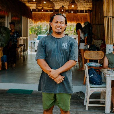 Wayan (Owner), father of 3, grew up farming seaweed with his parents on the beach in front of Penida Colada. Loves fishing, cooking and playing guitar. Also known as ‘Mr Fix It’. He’s handier than an octopus.